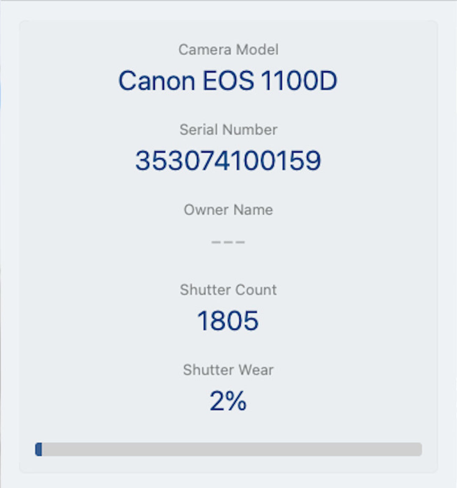 The shutter count is 1805, only under 2% of the estimated shutter life, so it still works like new.
