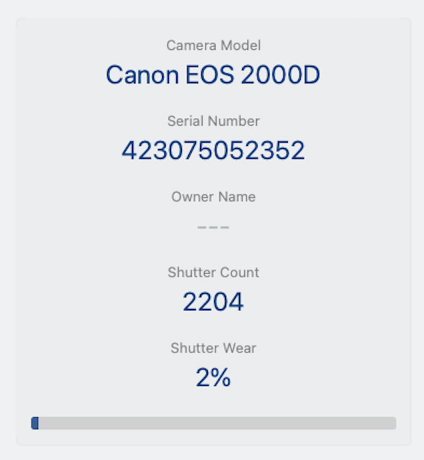Shutter Count: The shutter count is only 2204, just over 2% of the estimated shutter life, so it still works like new.