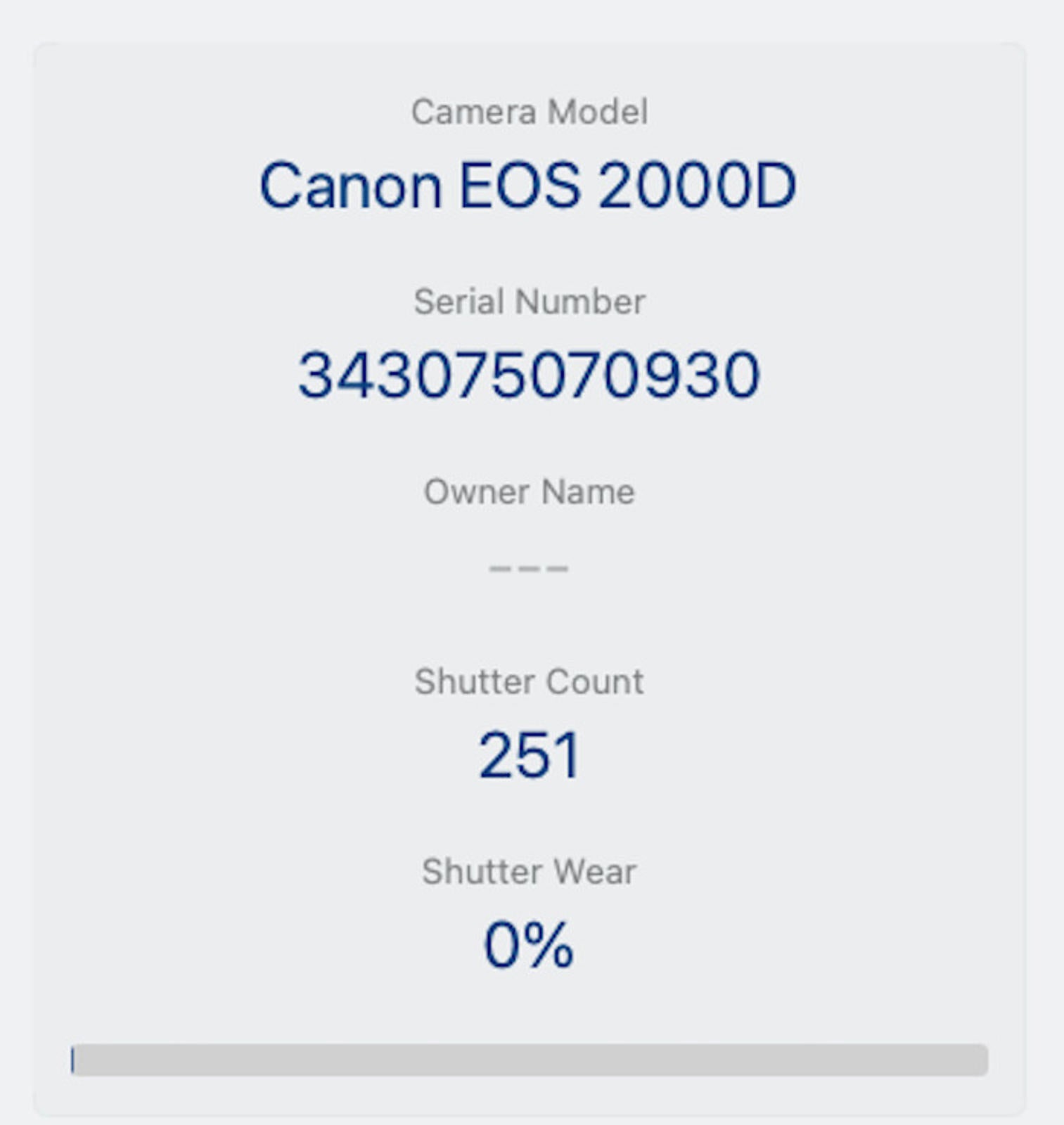 Shutter Count: The shutter count is only 251, just under 1% of the estimated shutter life, so there is plenty of life remaining from this great camera.