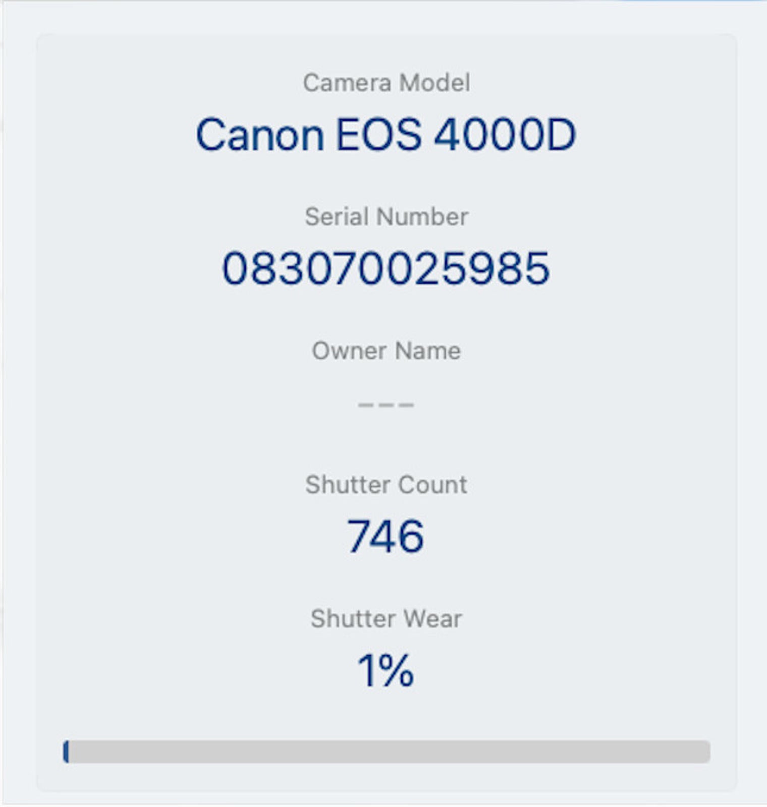 Shutter Count: The shutter count is 746, only under 1% of the estimated shutter life, so it still works like new.
