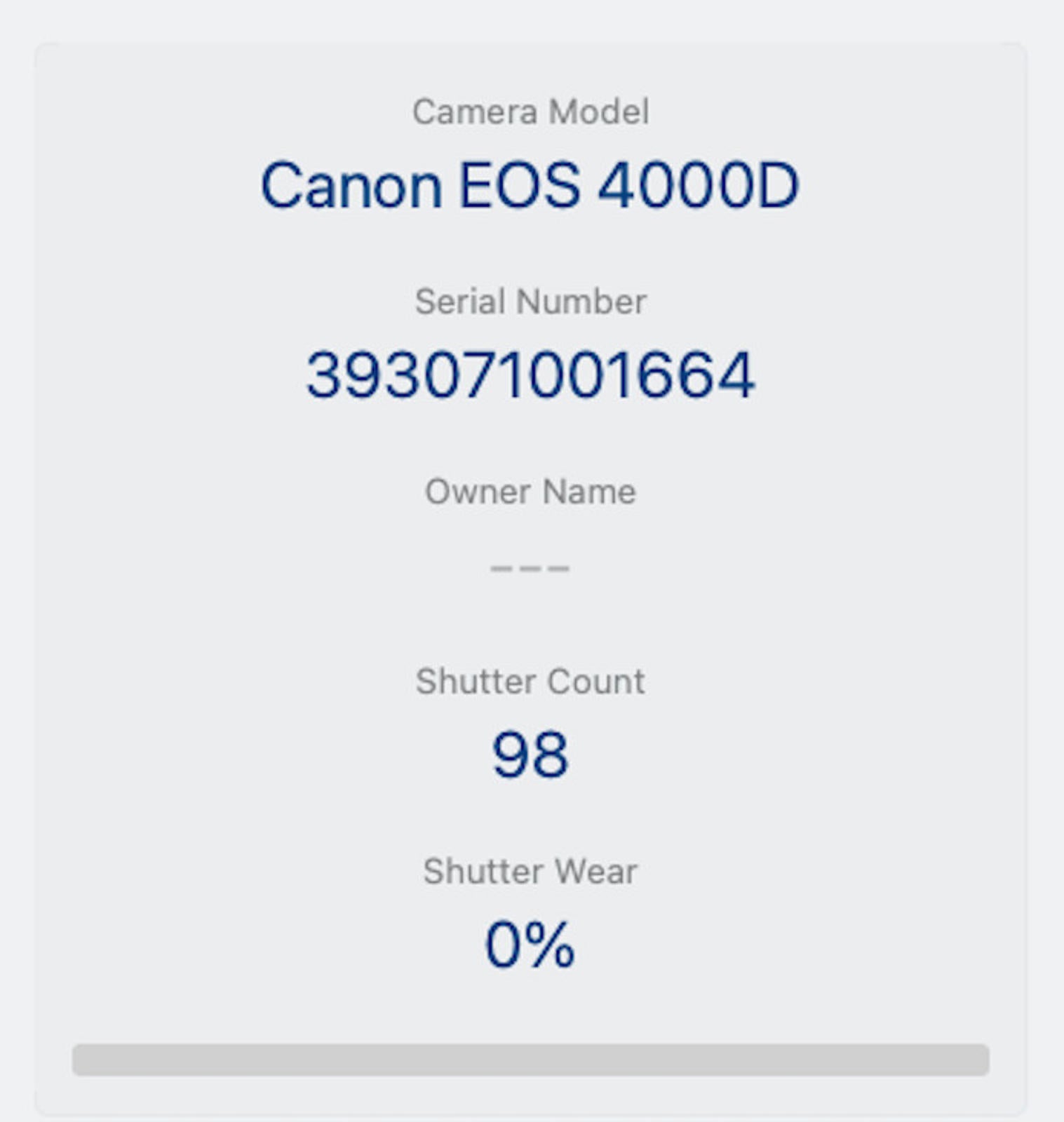 Shutter Count: The shutter count is 98, this camera has only taken 98 photos in order to be tested, only under 1% of the estimated shutter life, so it still works like new.