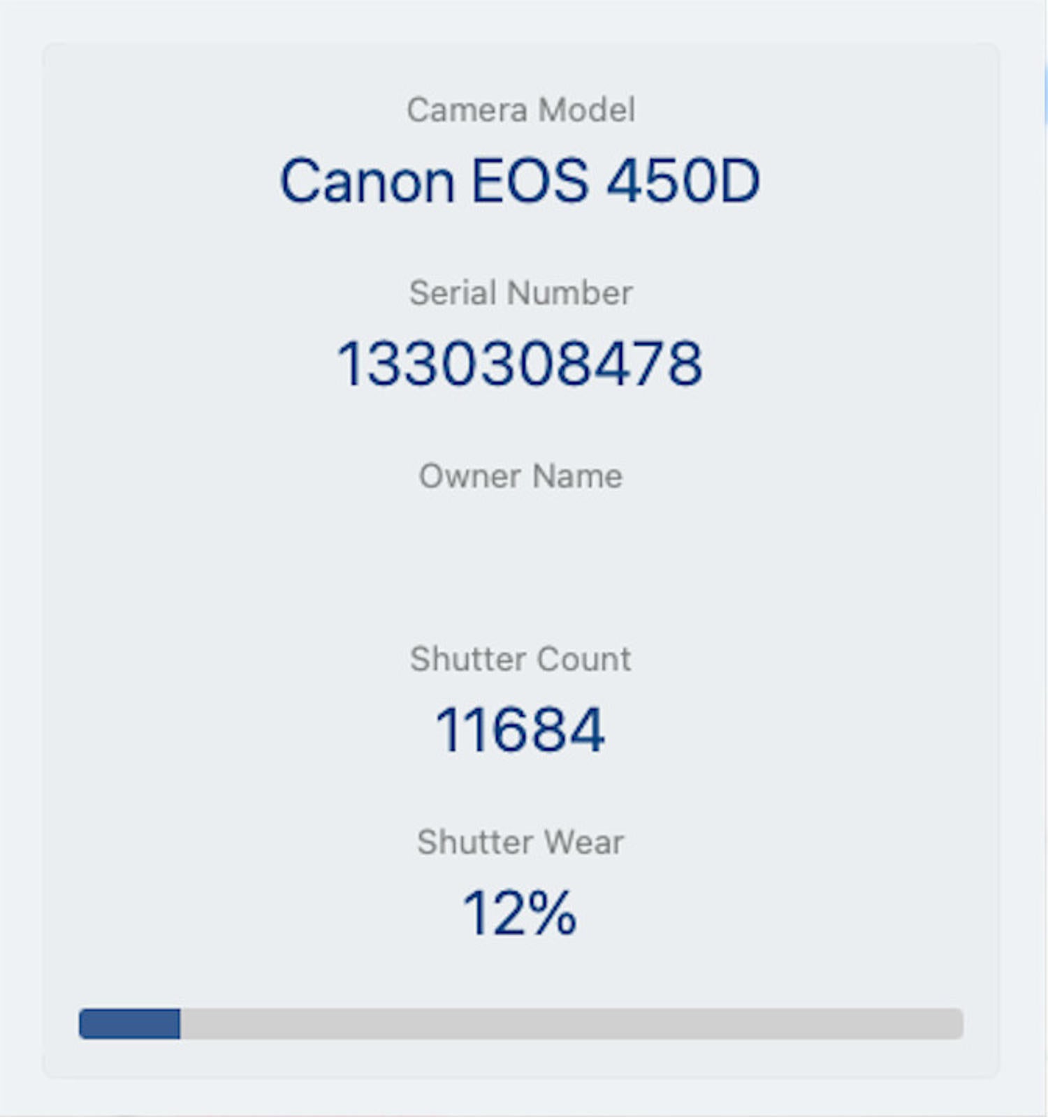 Shutter Count: The shutter count is just 11684, only under 12% of the estimated shutter life, so there is plenty of life remaining from this great camera.