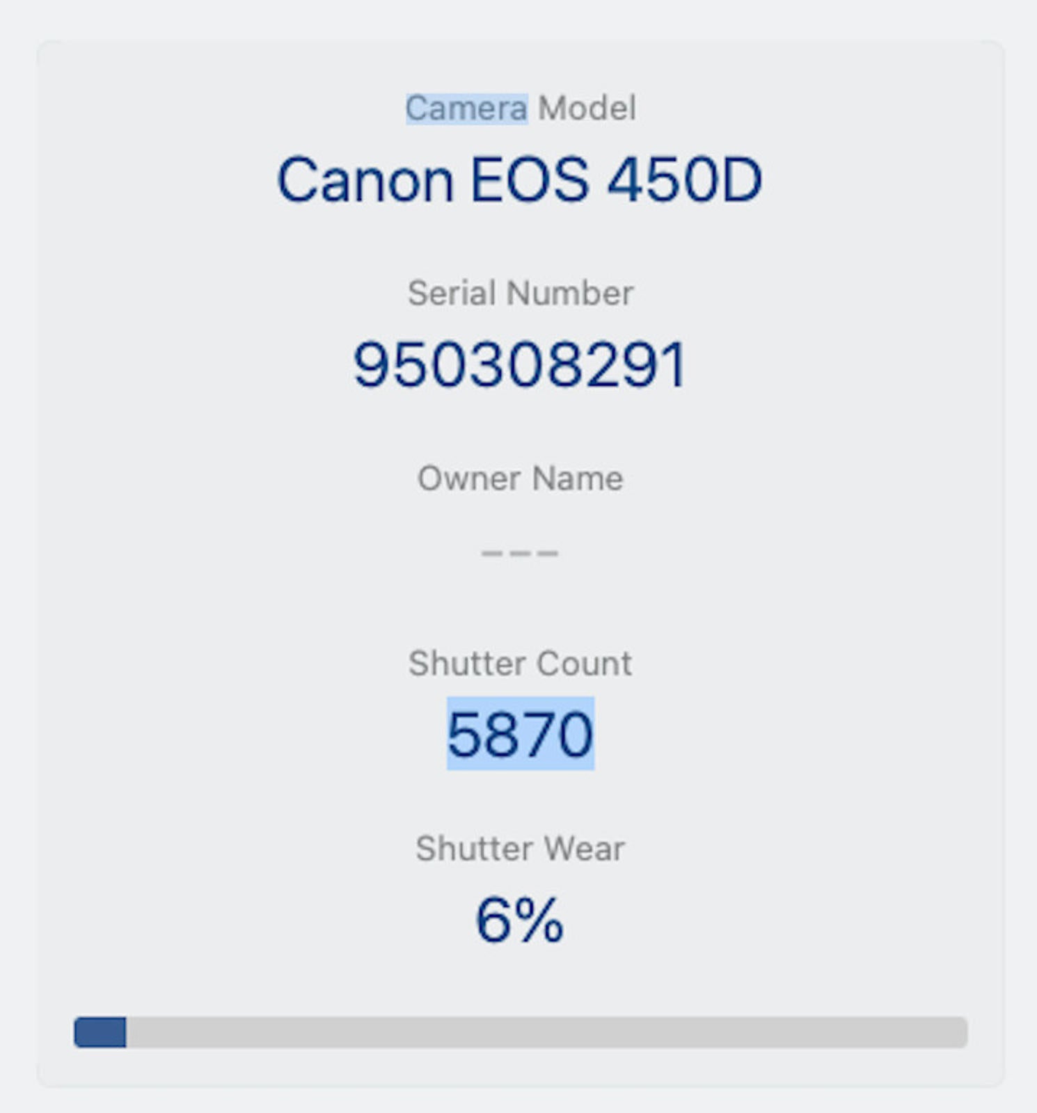 Shutter Count: The shutter count is just 5870, only under 6% of the estimated shutter life, so there is plenty of life remaining from this great camera.