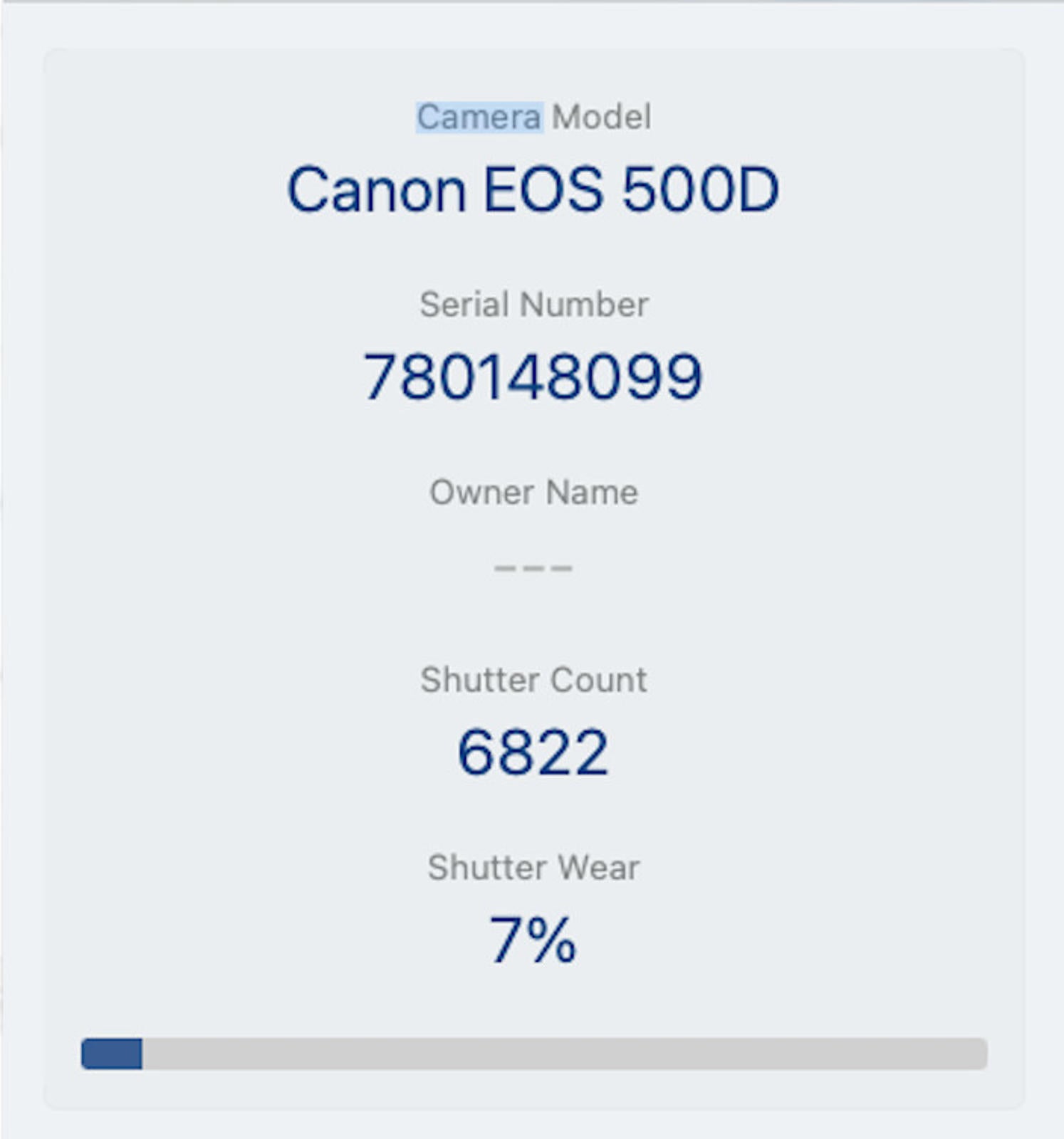 Shutter Count: The shutter count is 6822, just under 7% of the estimated shutter life, so there is plenty of life remaining from this great camera.