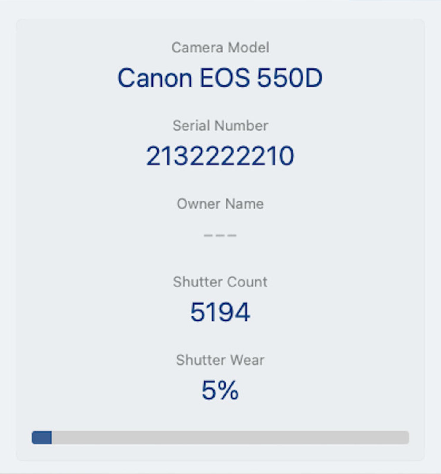 Shutter Count: The shutter count is 5194, just over 5% of the estimated shutter life, so it still works like new.