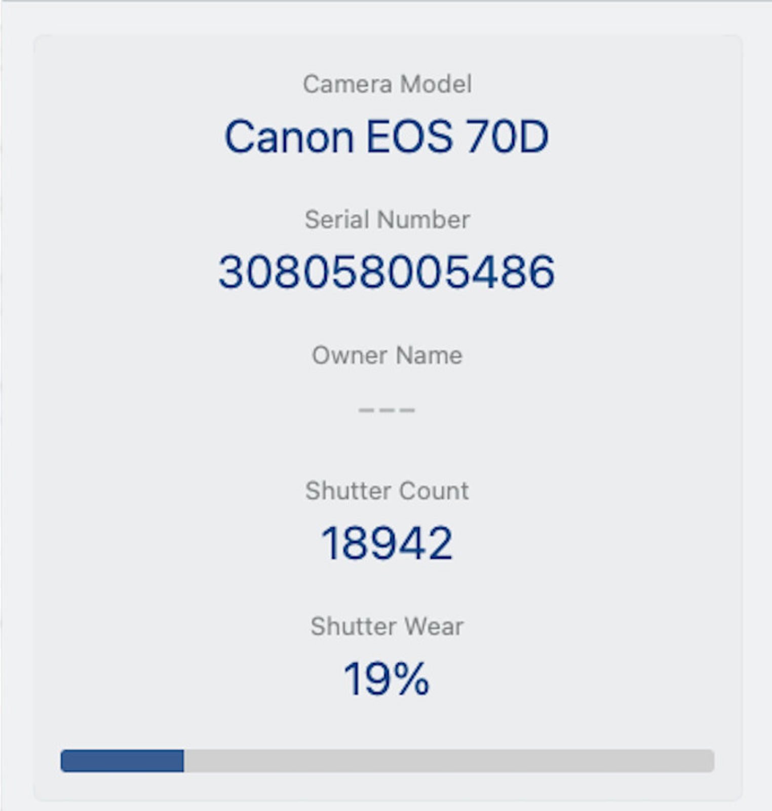Shutter Count: The shutter count is just 18942, only under 19% of the estimated shutter life, so there is plenty of life remaining from this great camera.
