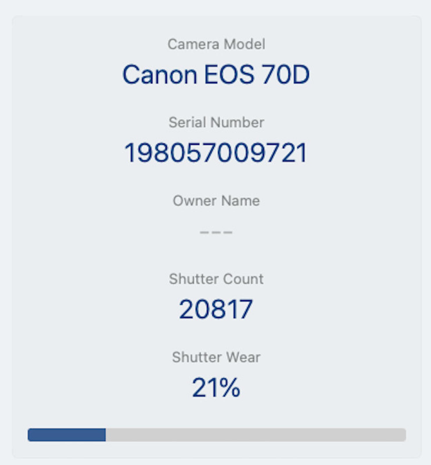 Shutter Count: The shutter count is just 20817, only over 20% of the estimated shutter life, so there is plenty of life remaining from this great camera.