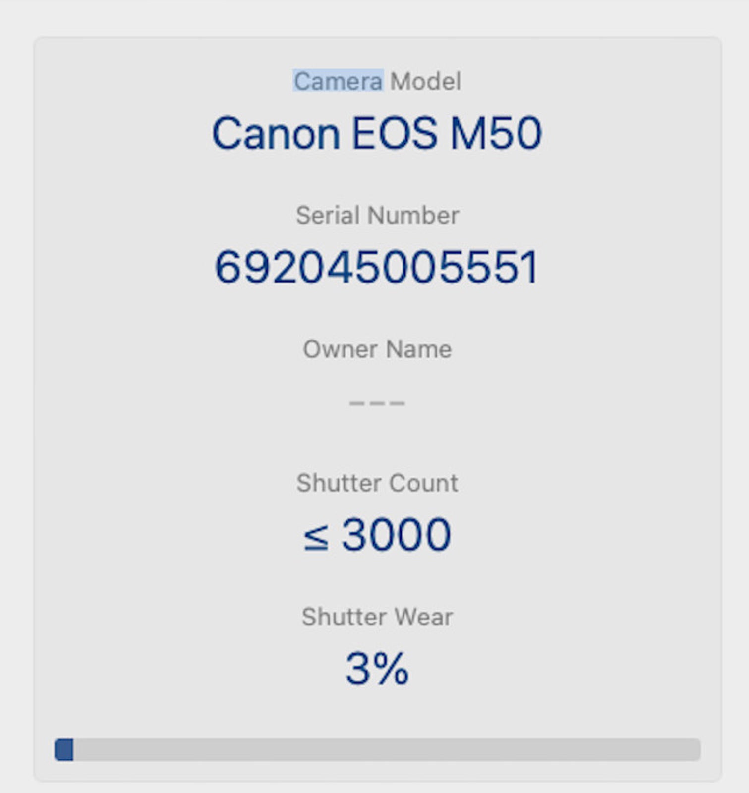 Shutter Count: The shutter count is under 3000, less than 3% of the estimated shutter count, so it still works like new.