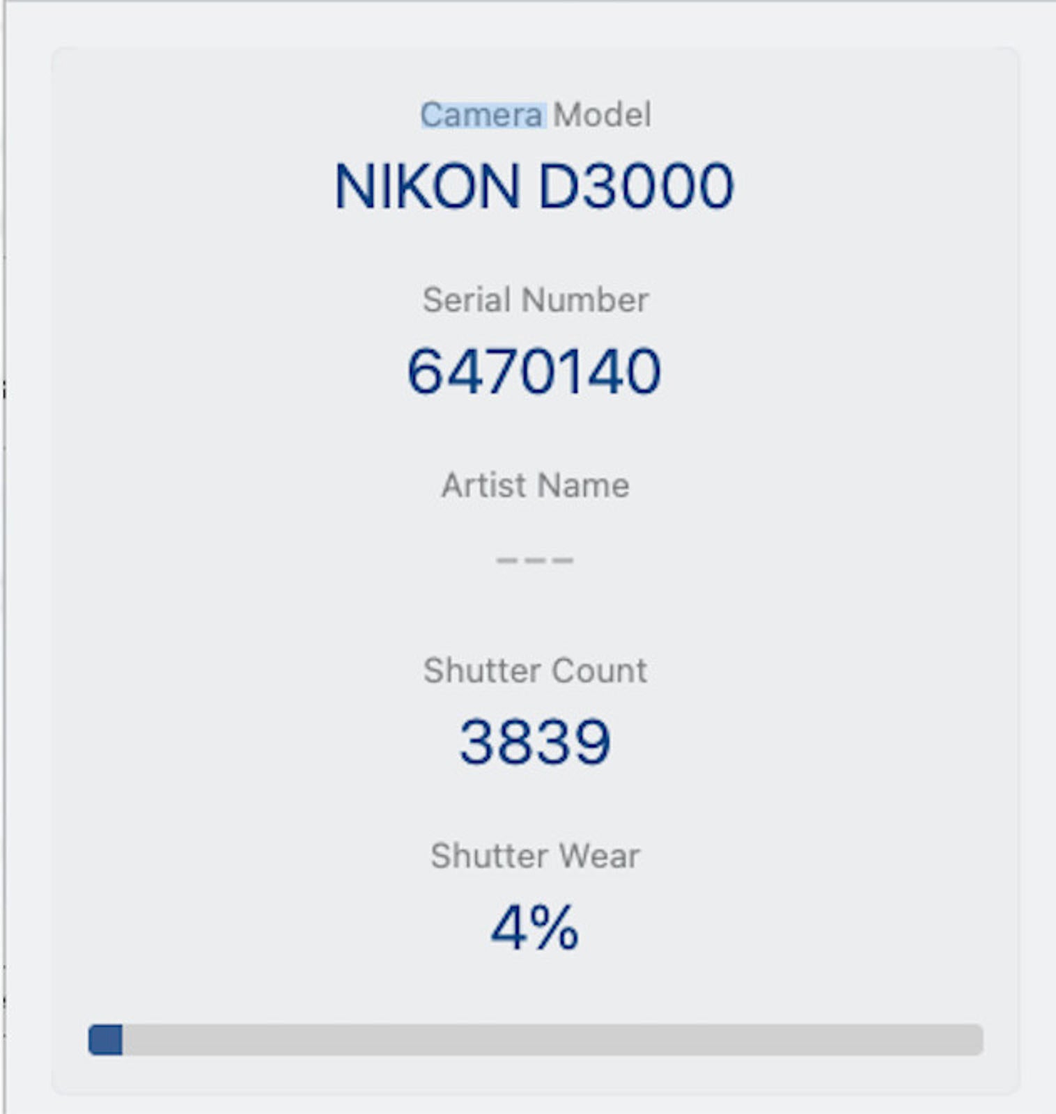 Shutter Count: The shutter count is just 3839, only under 4% of the estimated shutter life, so there is plenty of life remaining from this great camera.