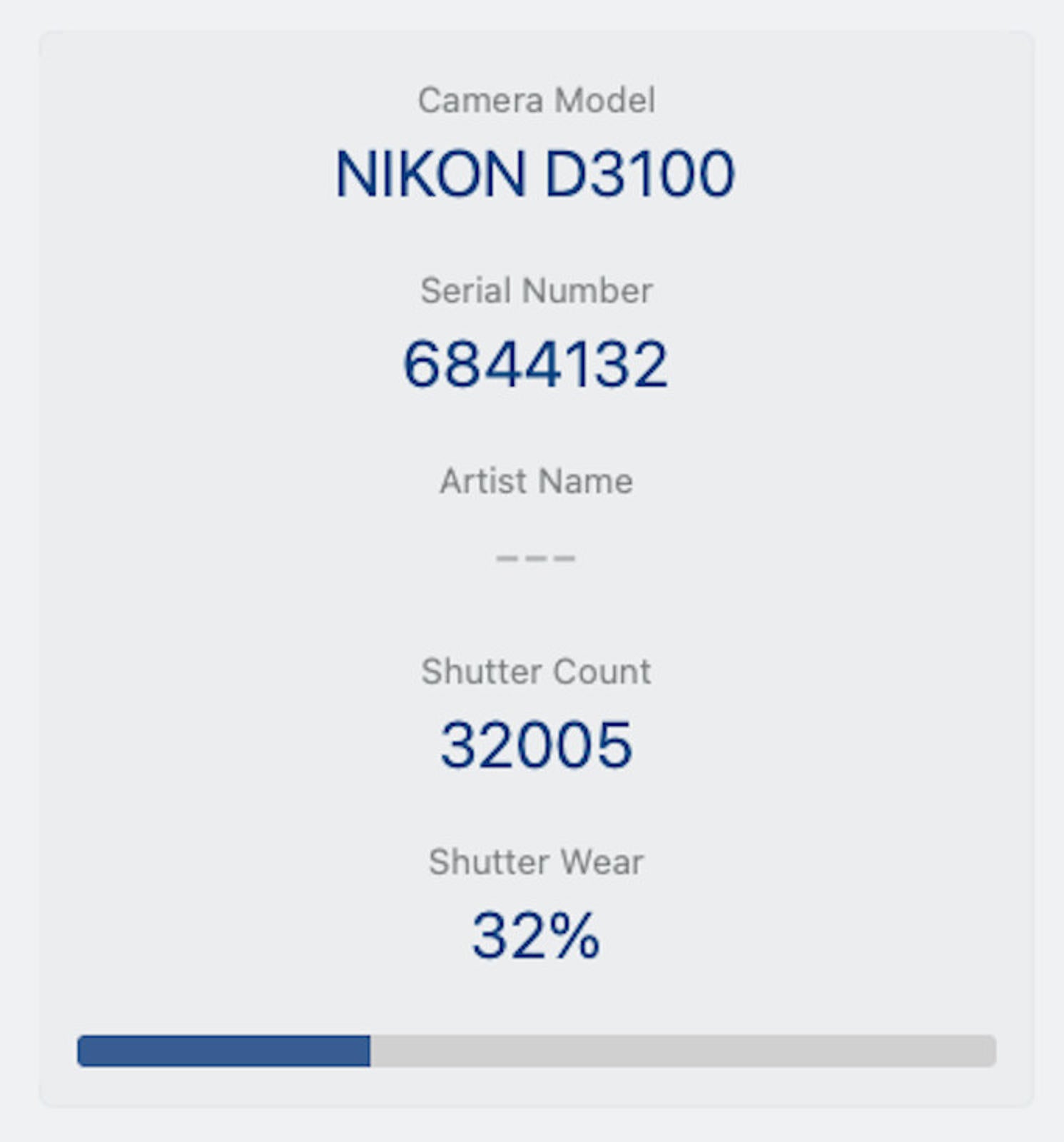 Shutter Count: The shutter count is just 32005, only over 32% of the estimated shutter life, so there is plenty of life remaining from this great camera.