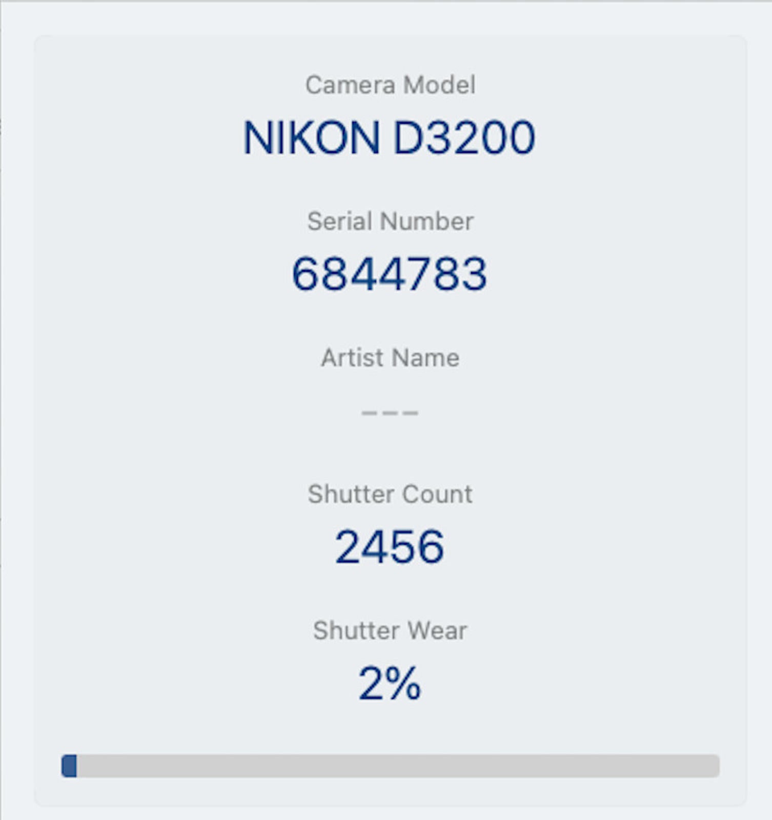 Shutter Count: The shutter count is only 2456, just under 3% of the estimated shutter life, so it still works like new.