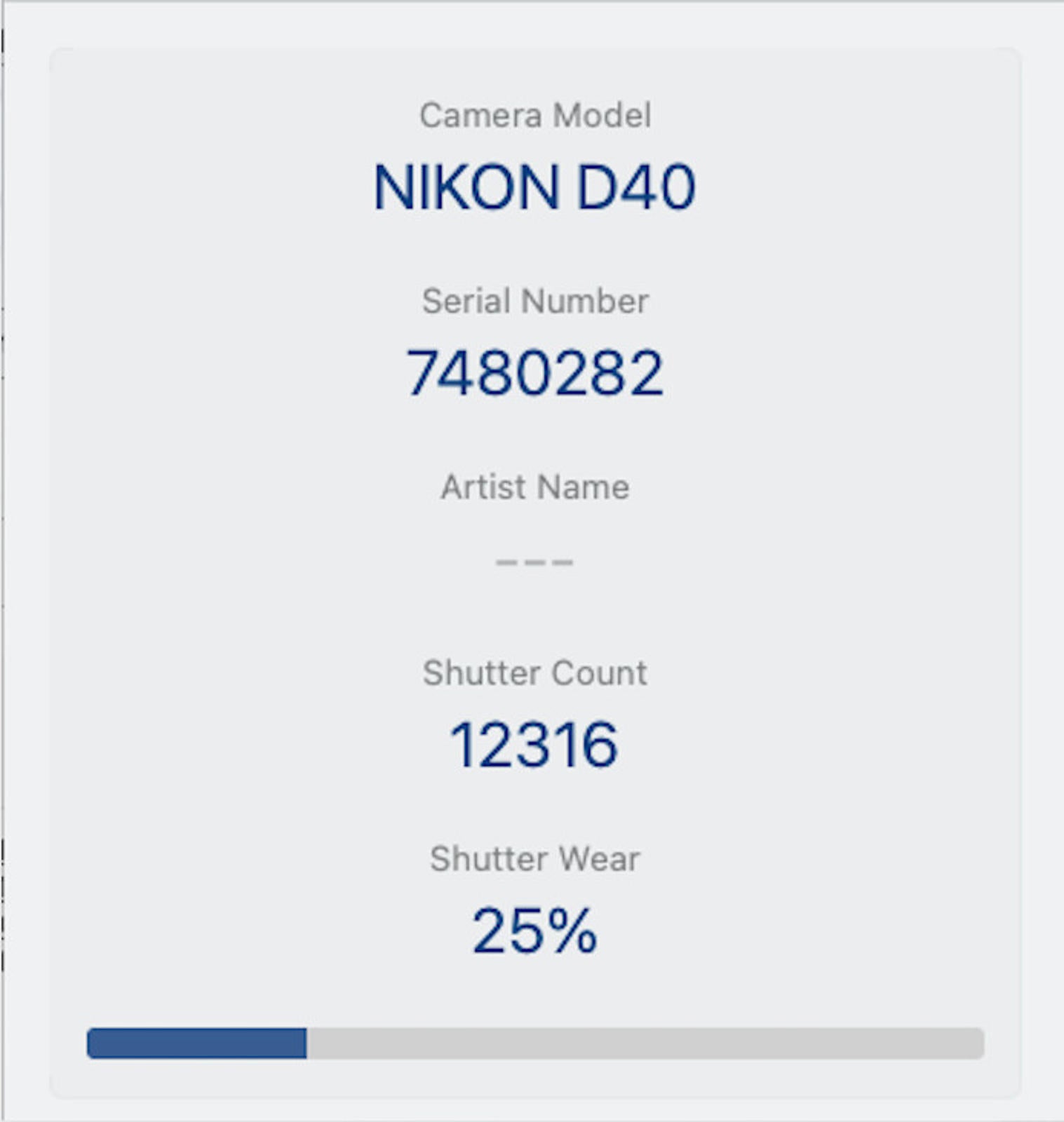 The shutter count is 12316, under 25% of the estimated shutter life, so there is plenty of life remaining from this great camera.