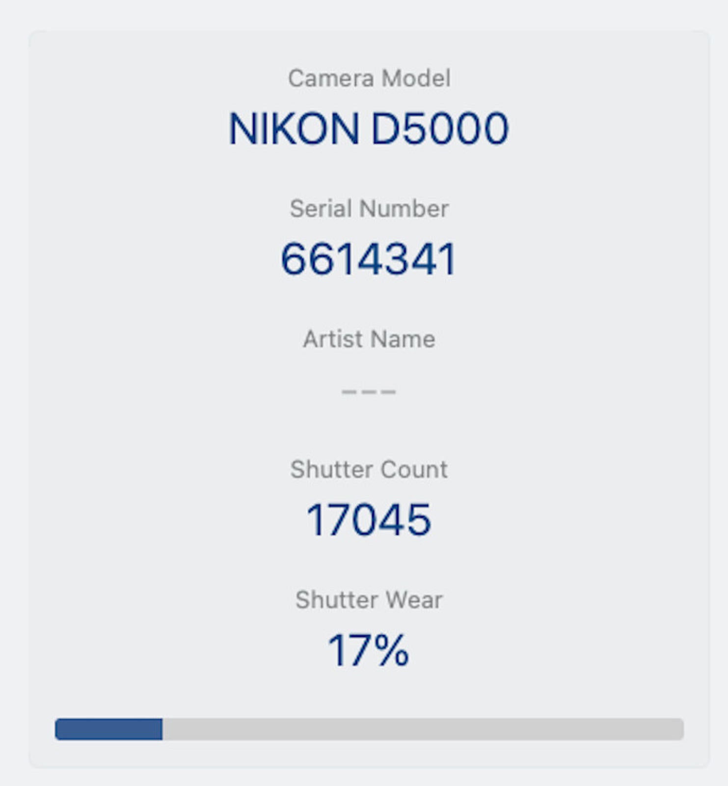 Shutter Count: The shutter count is only 17045, just over 17% of the estimated shutter life, so there is plenty of life remaining from this great camera.
