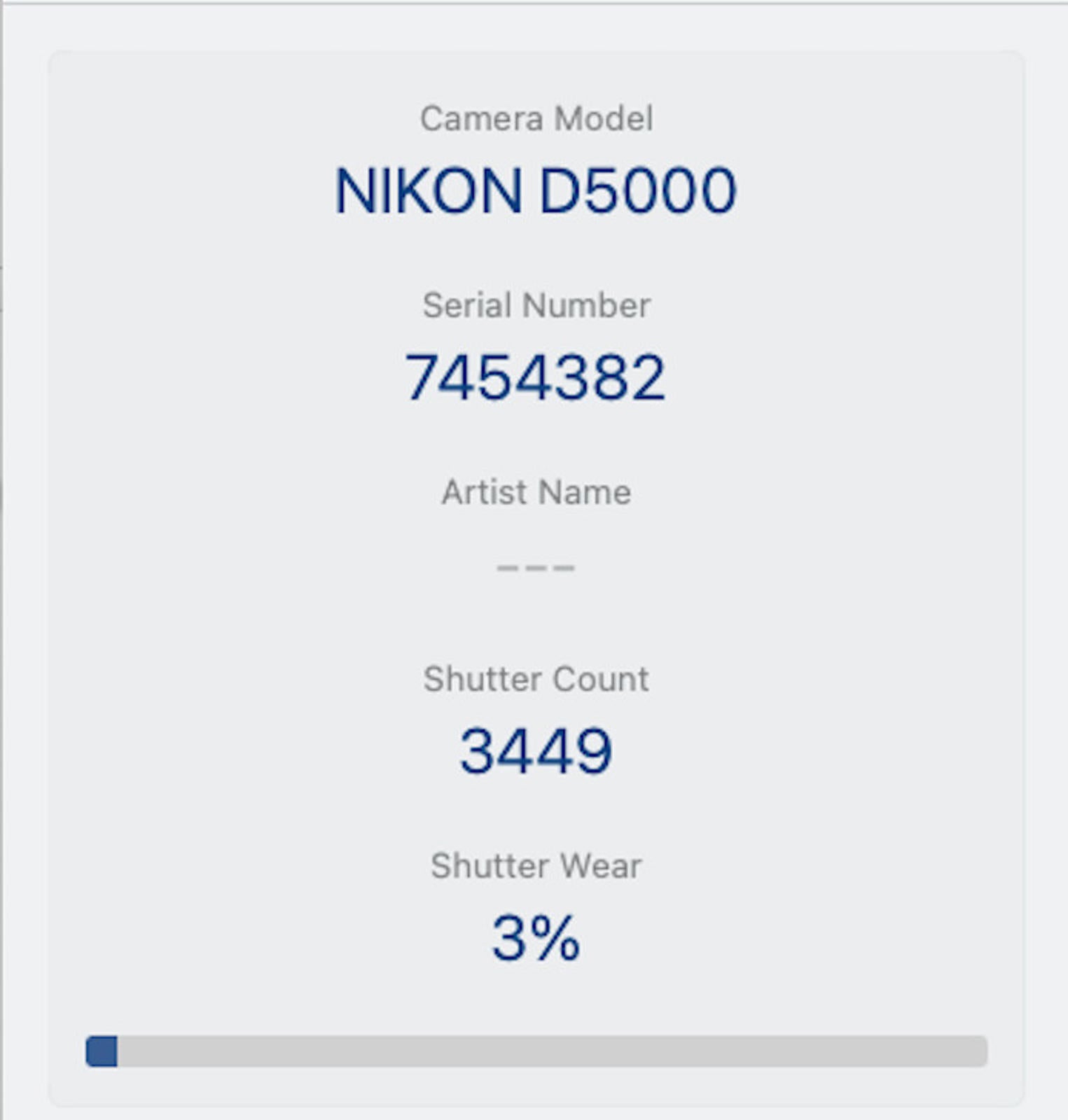 Shutter Count: The shutter count is only 3449, just over 3% of the estimated shutter life, so it still works like new.