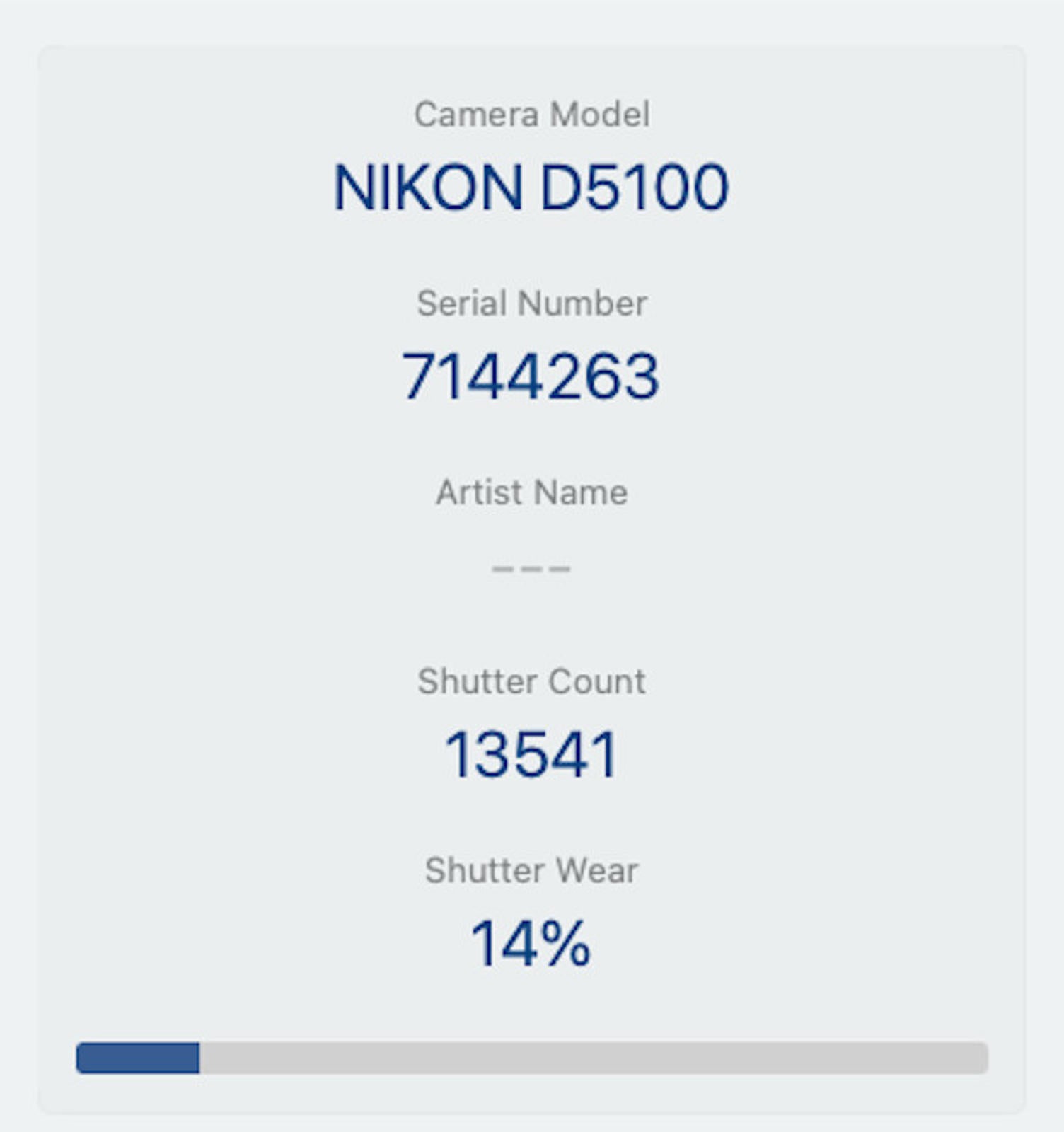 Shutter Count: The shutter count is just 13541, only over 13% of the estimated shutter life, so there is plenty of life remaining from this great camera.