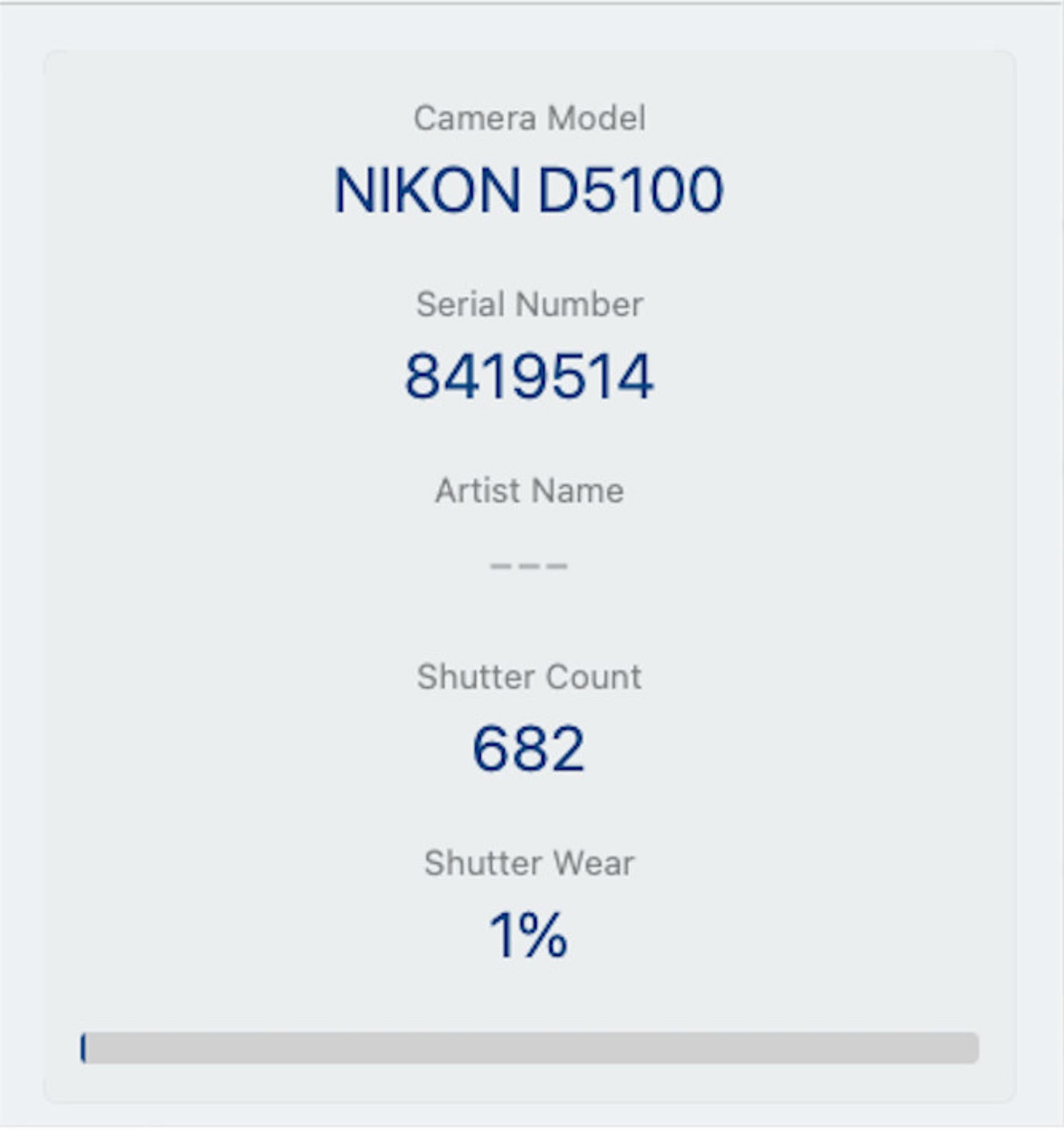 Shutter Count: The shutter count is just 682, only under 1% of the estimated shutter life, so it still works like new.