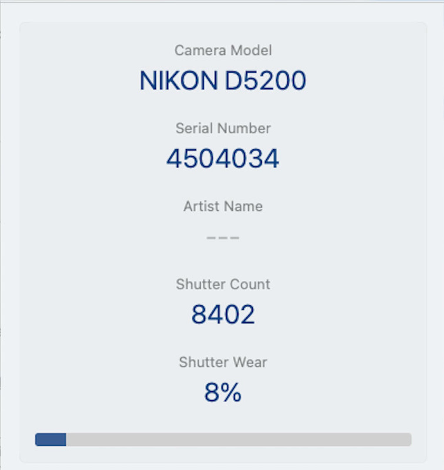 Shutter Count: The shutter count is 8402, just over 8% of the estimated shutter life, so there is plenty of life remaining from this great camera.