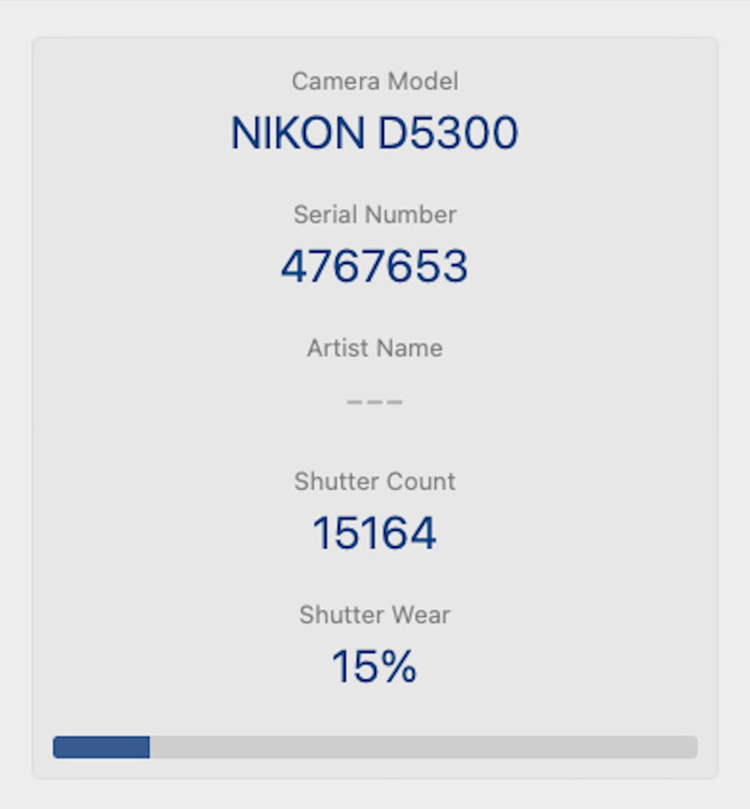 Shutter Count: The shutter count is only 15164, just over 15% of the estimated shutter life, so there is plenty of life remaining from this great camera.