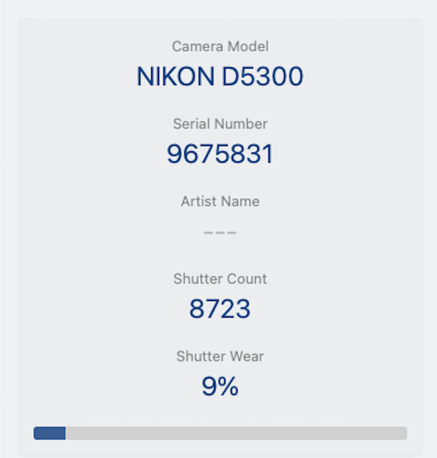 Shutter Count: The shutter count is 8723, only under 9% of the estimated shutter life, so there is plenty of life remaining from this great camera.