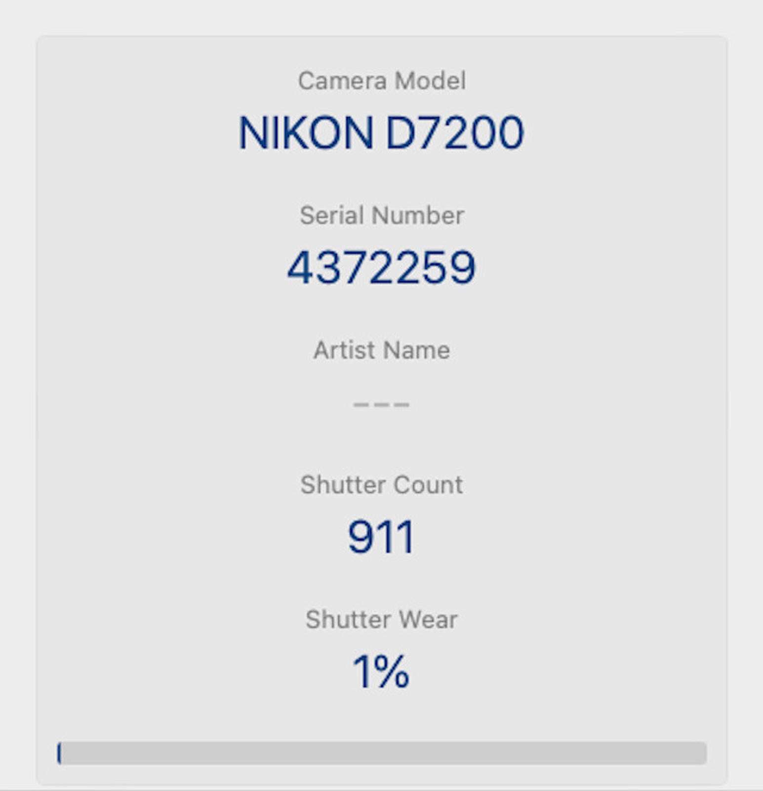 Shutter Count: The shutter count is just 911, only under 1% of the estimated shutter life, so it works like new.