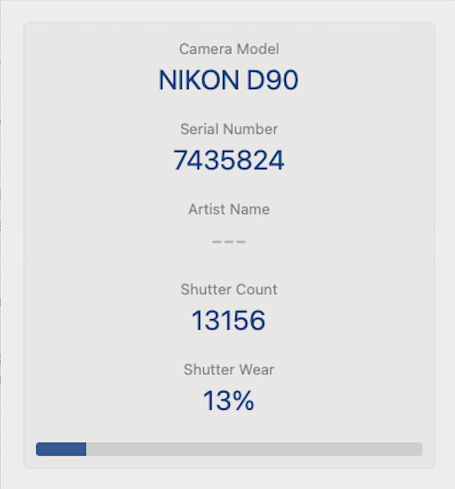 Shutter Count: The shutter count is 13156, only over 13% of the estimated shutter life, so there is plenty of life remaining from this great camera.