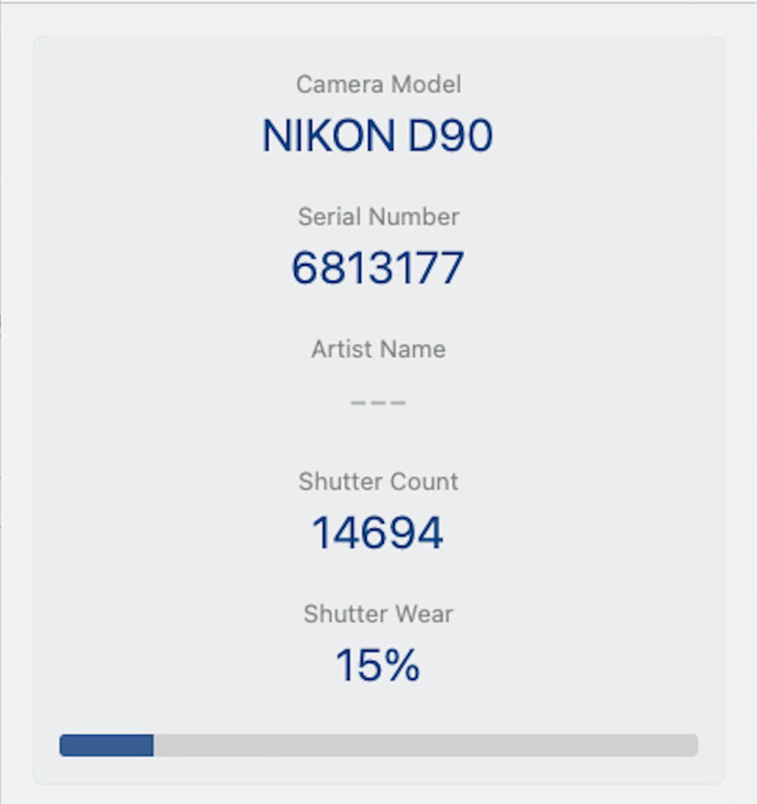 Shutter Count: The shutter count is 14694, only under 15% of the estimated shutter life, so there is plenty of life remaining from this great camera.