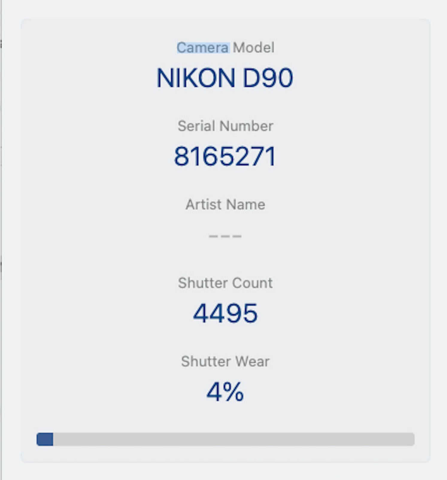 Shutter Count: The shutter count is 4495, only under 5% of the estimated shutter life, so it still works like new.