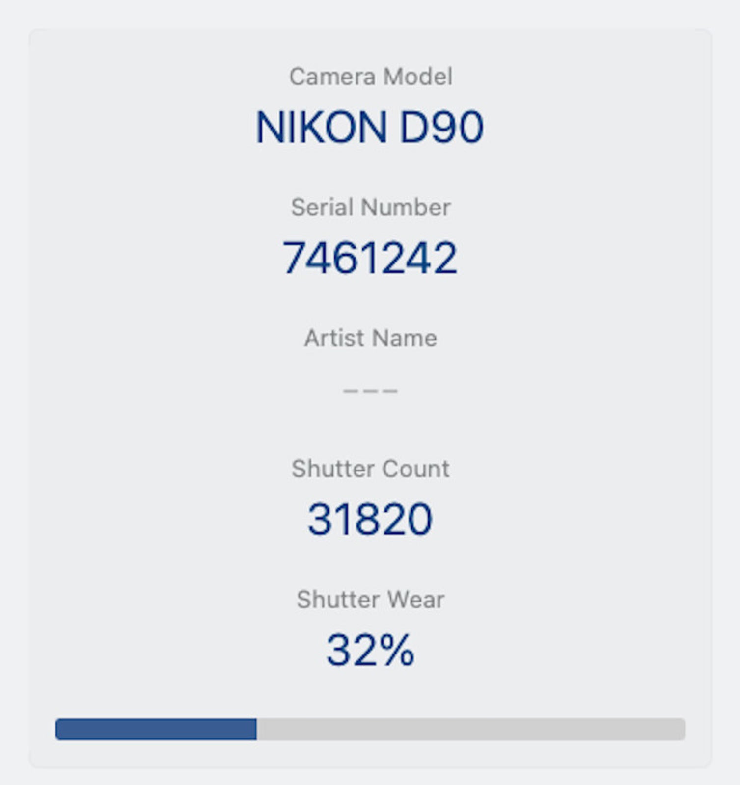 Shutter Count: The shutter count is 31820, only over 32% of the estimated shutter life, so there is plenty of life remaining from this great camera.