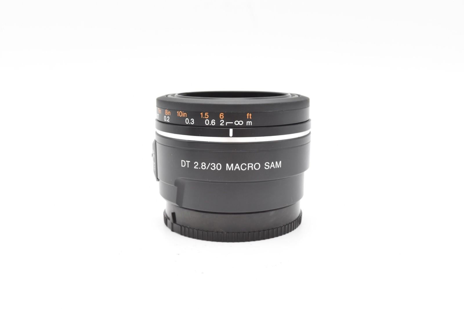 For sale a Sony 30mm Macro Lens f/2.8 SAM, Fixed, Very Sharp in excellent working condition. Light, compact macro lens ideal for photography of flowers, insects and other small subjects1:1 magnification ratio with 2cm minimum focusing distance for extremely clear, life-size close-upsFixed focal length design offers high quality optical performanceDT lens design optimized for cameras with APS-C sensor - light, compact and easy to carrySmooth Autofocus Motor (SAM) for smooth AF operation