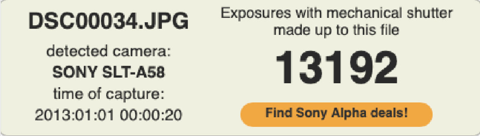 Shutter Count: The shutter count is 13192, just over 13% of the estimated shutter life, so there is plenty of life remaining from this great camera.