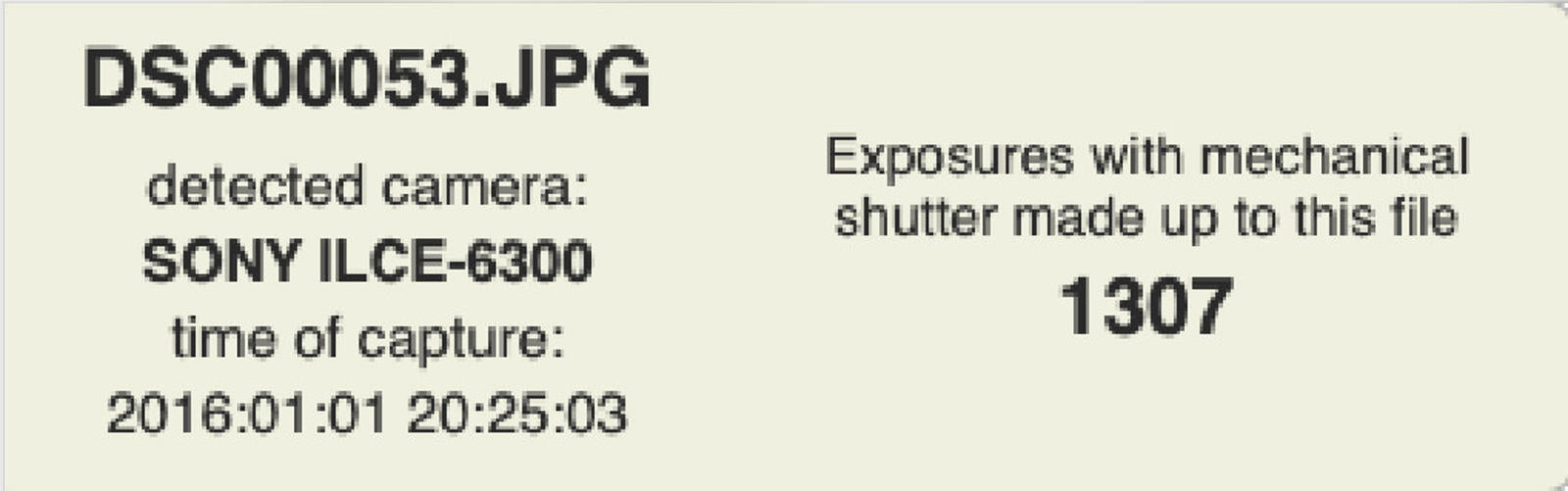 Shutter Count: The shutter count is 1307, only over 1% of the estimated shutter life, so it still works like new.