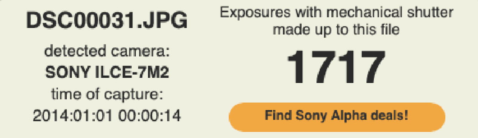 Shutter Count: The shutter count is just 1717, under 2% of the estimated shutter life, so it still works like new.